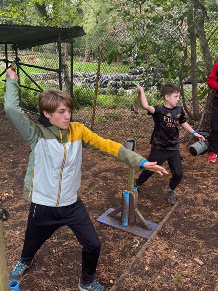 After a brief rest to the joy of their weary legs, followed by a hearty meal in the cafeteria, the wanderers were ready for their next challenge. Split into teams of teaching groups, each child tackled two of the following activities; ziplining, Jacob's ladder, tomahawk throwing and the inventively named "Mr Payne's Water Challenge...thing..." Staff supervising their endeavours reported that behaviour during these activities were excellent, and I'm very pleased to report that there were no casualties beyond a sprained ankle. After setting up in their camps and their second hot meal of the day, Team Cheney were led down to the campfire by their scout volunteers for a hearty sing-song and that most important of campfire activities - toasting marshmallows. After a balmy night in their tents, the gallant company indulged in a nourishing breakfast before wending their way back to Cheney school by foot. While their adventure was coming to a close, another party was venturing westward, eager to experience the joys of the camp, and a third band repeated this walk on Tuesday 23 September, getting a chance to show their archery prowess as opposed to axe throwing.